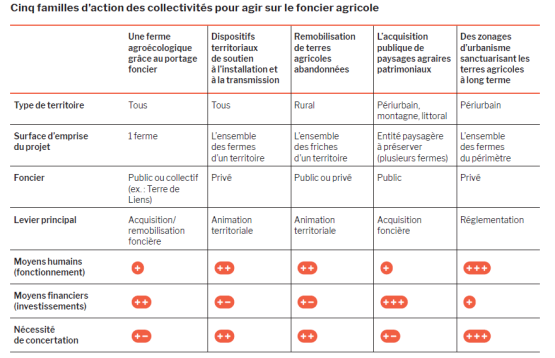 Le tableau ci-dessus montre que parmi ces cinq familles d’action, certaines sont plus adaptées à des territoires ou types de foncier. Elles mobilisent différents leviers d’action publique et ne nécessitent donc pas les mêmes moyens humains et financiers. Anticiper ces moyens, et la temporalité souvent longue des projets fonciers, est déterminant pour leur réussite, tout comme la concertation préalable entre acteurs au sein d’un réseau plus ou moins important selon le projet.